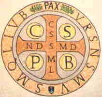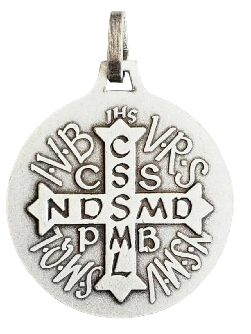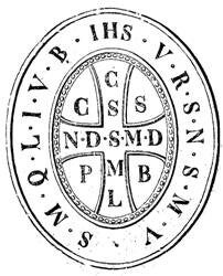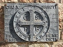C.S.P.B. (entourant la croix) : Crux Sancti Patris Benedicti (Croix du Saint Père Benoît).