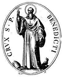 L'effigie de Saint Benoît tenant une croix dans sa main droite et la Règle de son ordre dans sa main gauche.